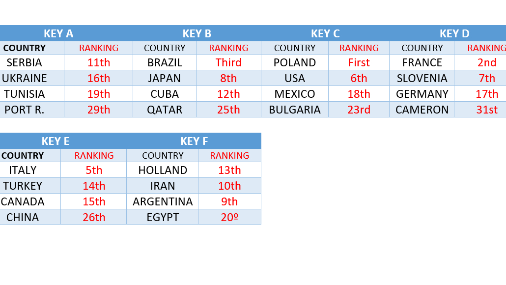 Below are the Keys with the respective selections and their positions in the FIVB Ranking before starting the world.