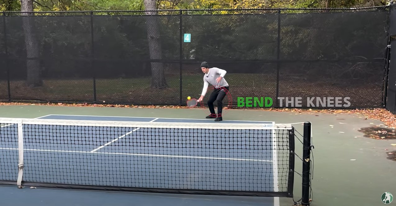 So we want to get down low with our knees and keep our backs relatively upright. I'm going to come down and as I hit, I lift. But, it's very important that I get down with my paddle under the ball using my knees. If I use my back, I'm going to be flicking the ball with my wrist of my shoulder and that's going to create a really inconsistent shot. So I have to get down with my knees.