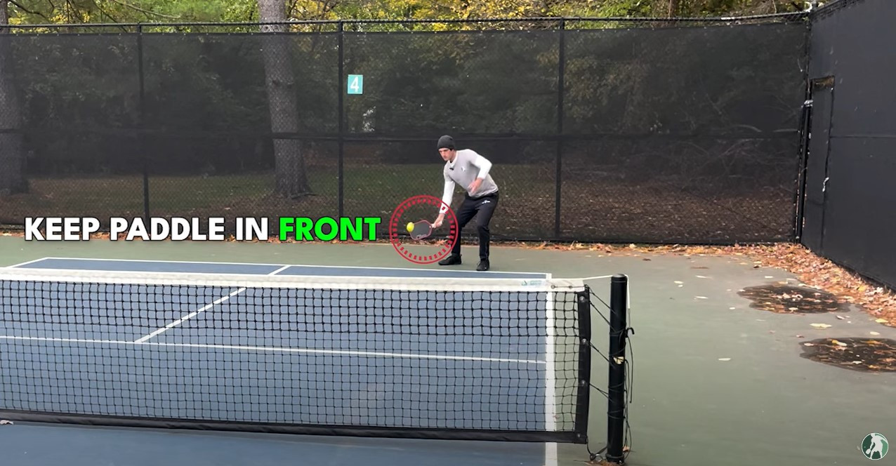 We want to eliminate the backswing, when we're preparing our paddle for the drop it needs to be out in front. So if I'm getting ready to hit my drop, I'm going to start with my paddle out in front and I'm only going to pull it back down to right in front of my feet. It's about six inches in front of my toes. No further back. A lot of players tend to take the paddle far back behind their legs on their drops, and this causes them to take too big of a backswing, which in turn causes the ball to pop up and get slammed. So that's the first tip. Paddle out in front at all times.