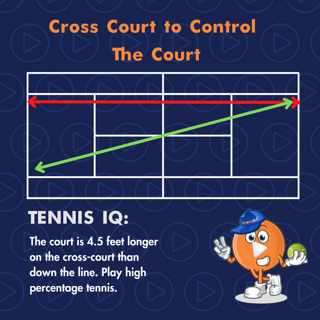 Understanding the geometry of the court will help you better understand how to improve your tennis IQ. Because the tennis court is a rectangle ( 78 x 36), the court is 4.5 feet longer on the crosscourt than down the line, so you have more space to hit your shots into the court. Hitting Crosscourt is a high percentage shot and involves less risk than hitting down the line. In addition, if you can control the crosscourt rally with consistency, spin, and depth, the more likely you are to receive a weak ball from your opponent that you can attack! Less risk and more reward!