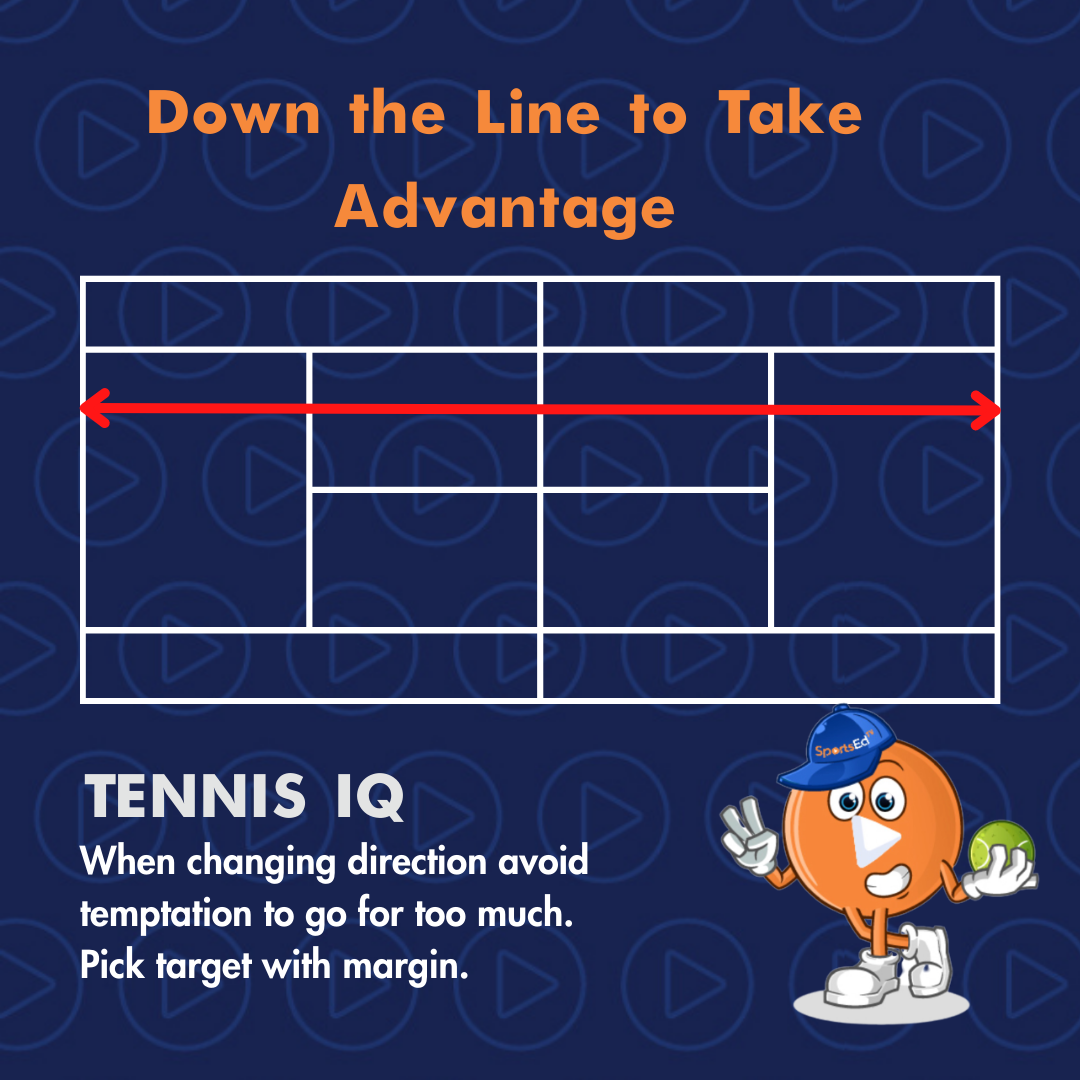 Of course, it's not possible to hit every shot crosscourt, take advantage of your opponents' weak shots, and get them moving. You need to be able to hit the open court, which often is down the line. Now, remember, when hitting a shot down the line, the court is 4.5 feet shorter, and the net is 6 inches, which means that having the ability to control the ball's pace, height, and spin will be important. What is also important is to know when to hit the ball down the line. In general, changing the direction of an incoming ball is when many unforced errors occur, but there are a few things to minimize the risk.