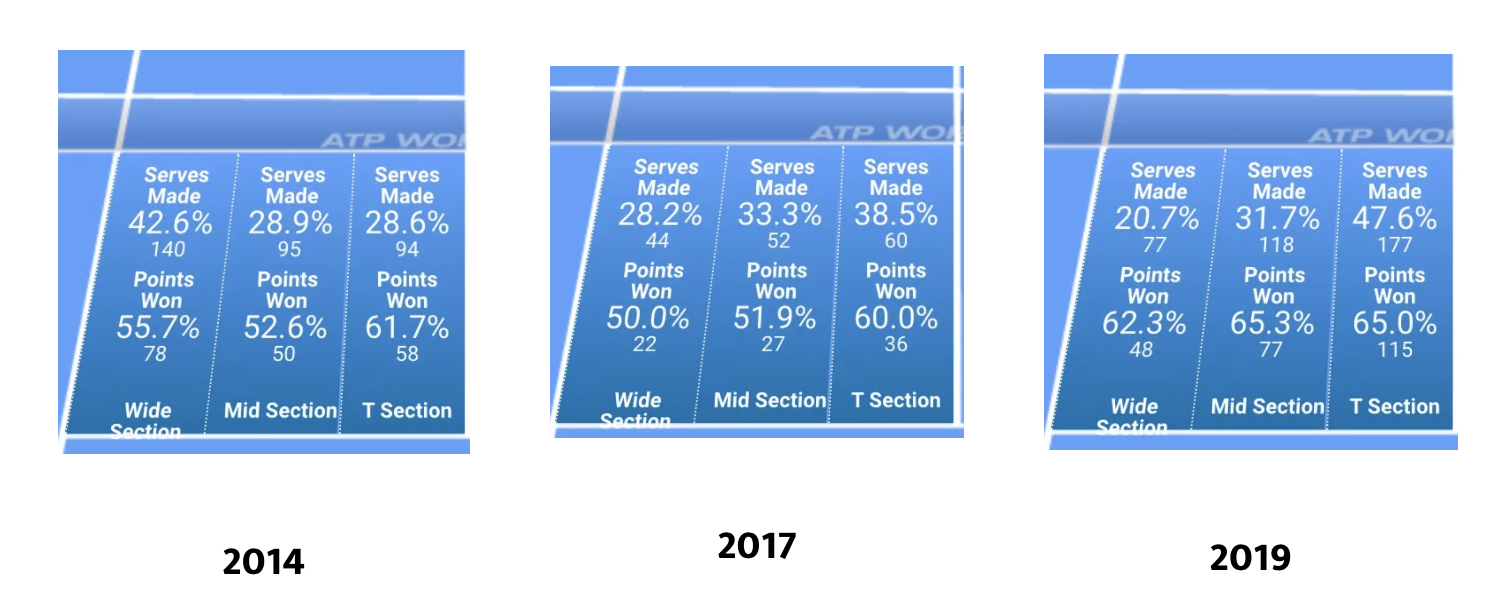 You can see that Novak started using this T serve more after 2014, but it saw a big jump in 2018/19. In 2019, his wide serve became more effective, possibly because it became so rare.
