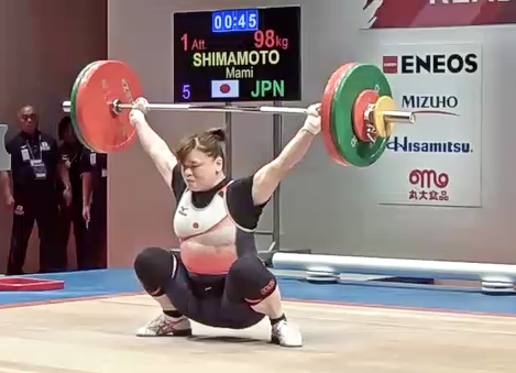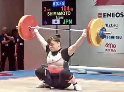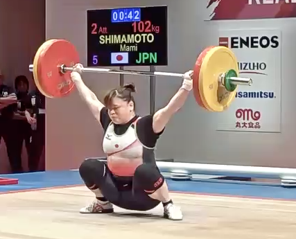 Japan’s Shimamoto takes a deeper squat during each of her successive snatch attempts.