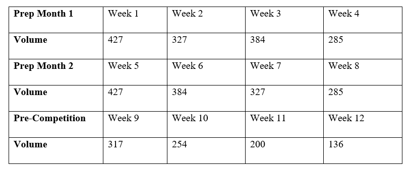 Average 4-week preparation mesocycle volume: 1,424 reps