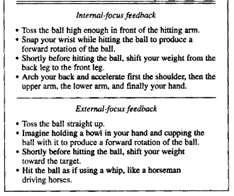 When internal and external instructions/feedback were compared, most of the studies found the best performance utilizing the external attentional focus (See review 1). According to the authors, when the focus of attention is directed internally, for instance, to joints or specific movements, it hinders the natural mechanisms of movement control.