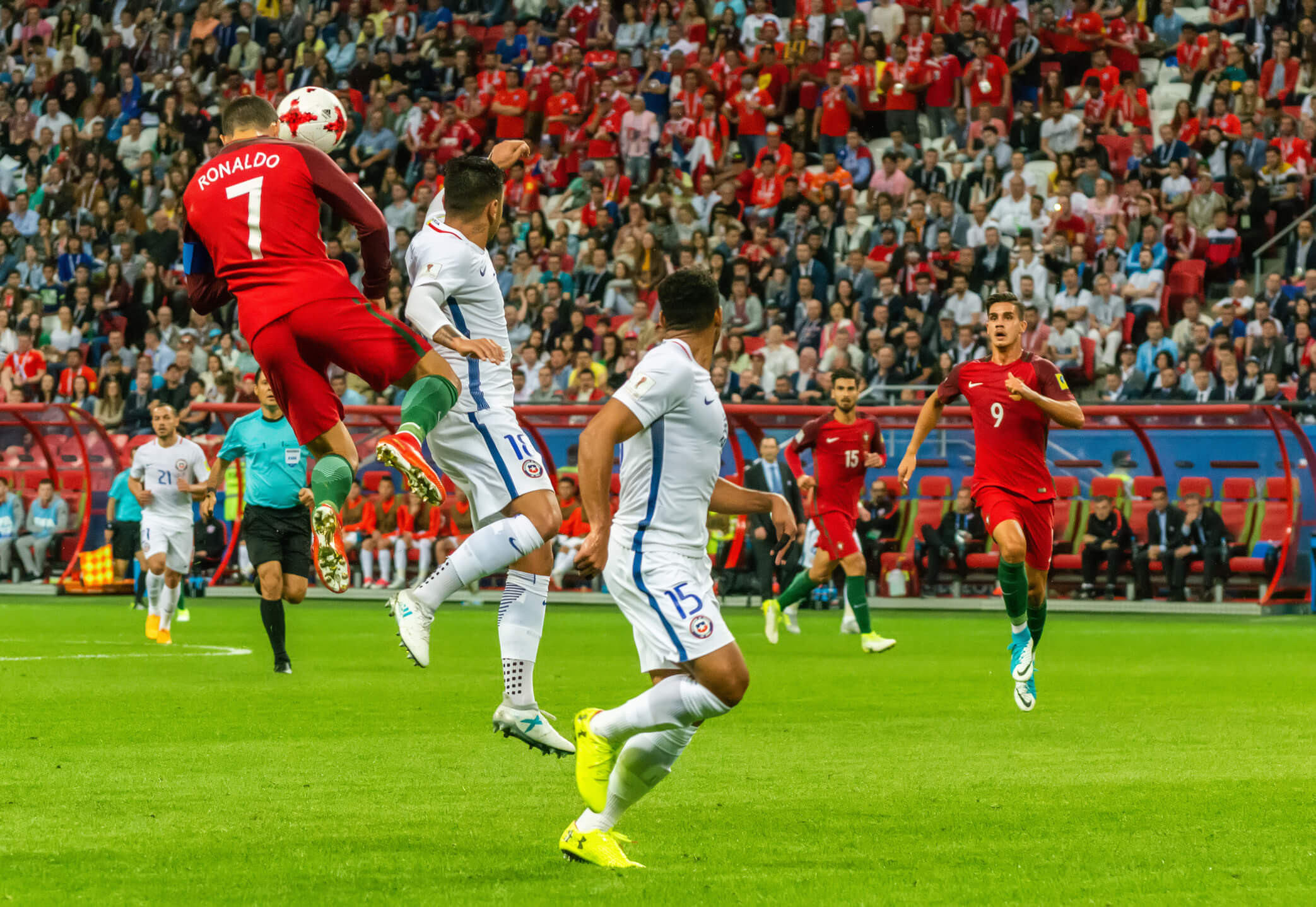 Cristiano Ronaldo, using anticipatory skills to time his run and jump to execute a header