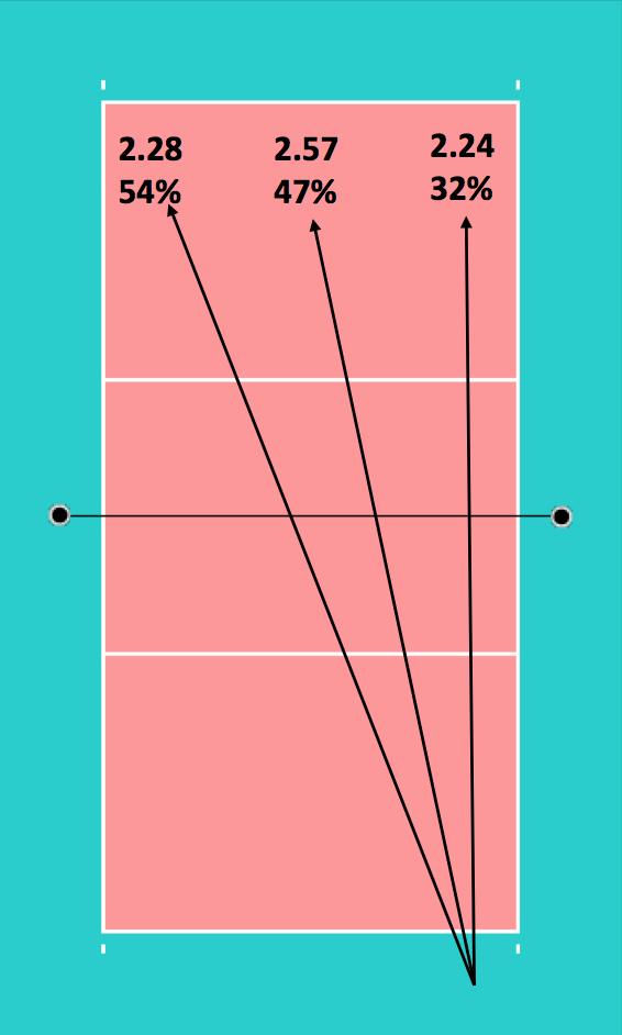 The first part of serve tactics is where the server positions themselves along the end line. If you look at the three diagrams below, you will see the results of over three thousand serve and serve-reception attempts at the national team level. The serve position was evaluated based on the quality of pass (4.0 scale) and the sideout percentage.