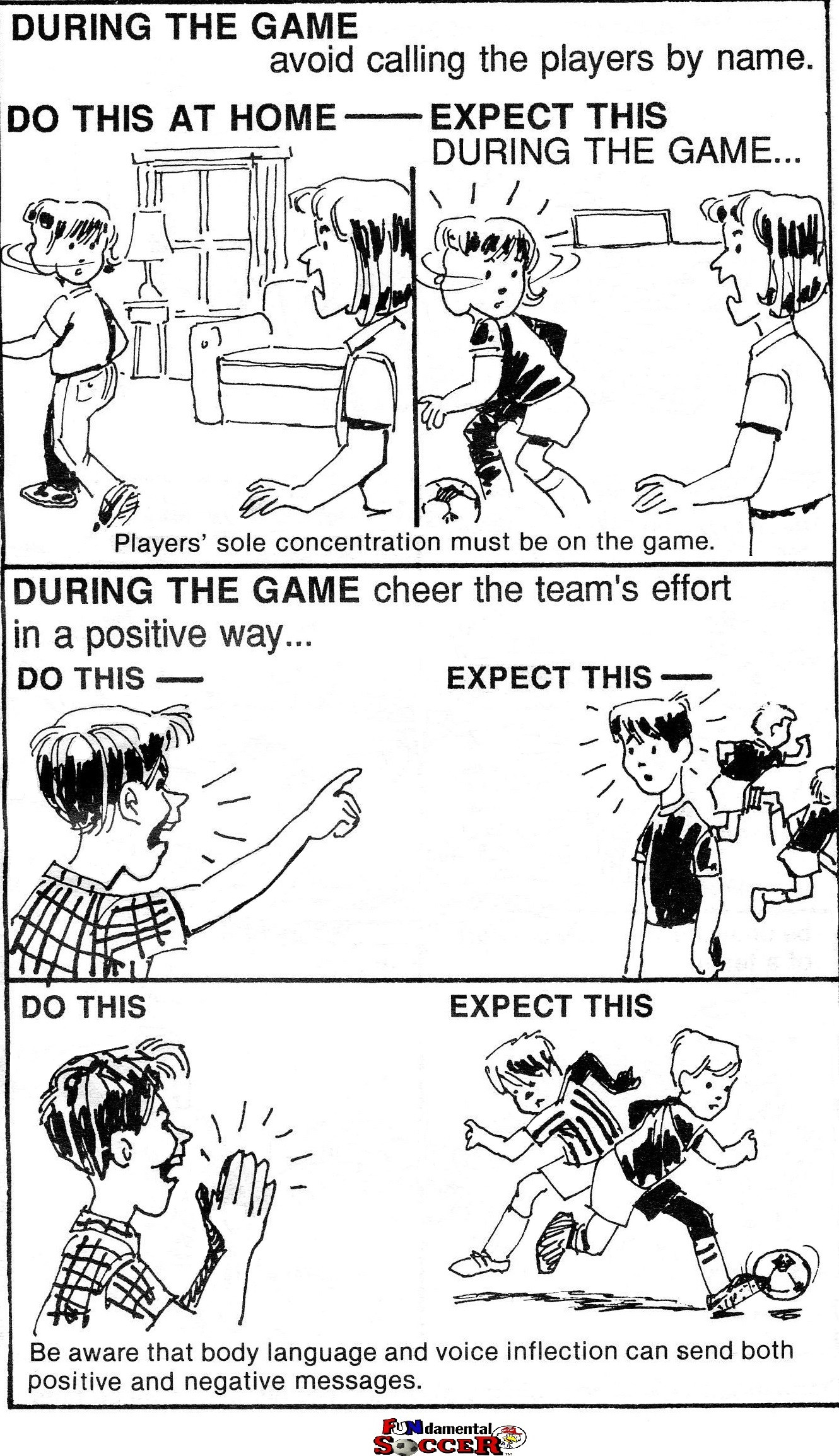 Just before the start of your child’s next game, think about the type of influence you want to have on your child during the game. If your comments and conduct during a game are caring and positive, your child will emulate you and enjoy playing soccer. Looking back, I wish I had done so.