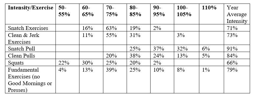 The percentages below represent the annual volume for the designated exercise group. These are guideline numbers proven to be effective and may be modified by a skillful coach depending on the individual athlete’s situation.
