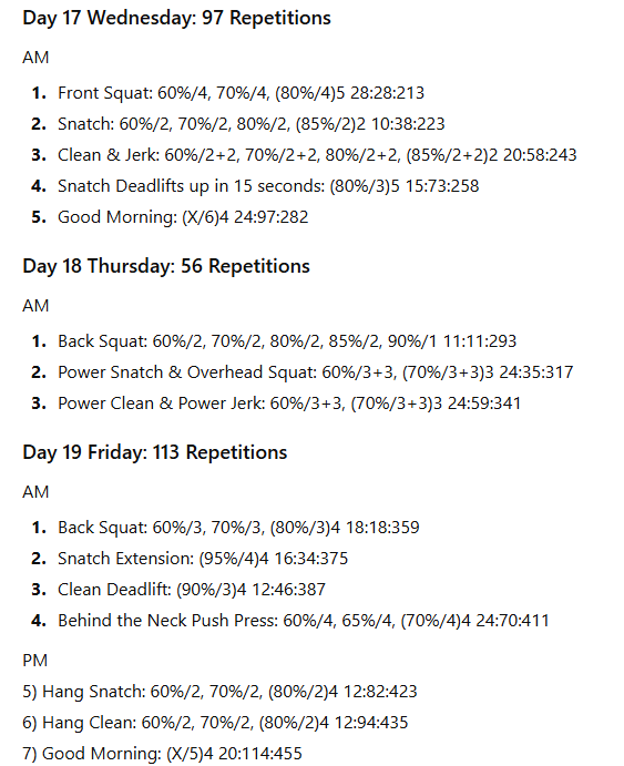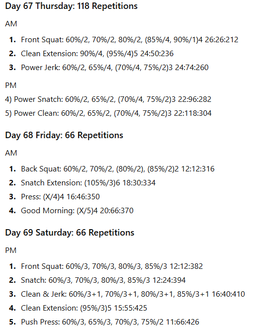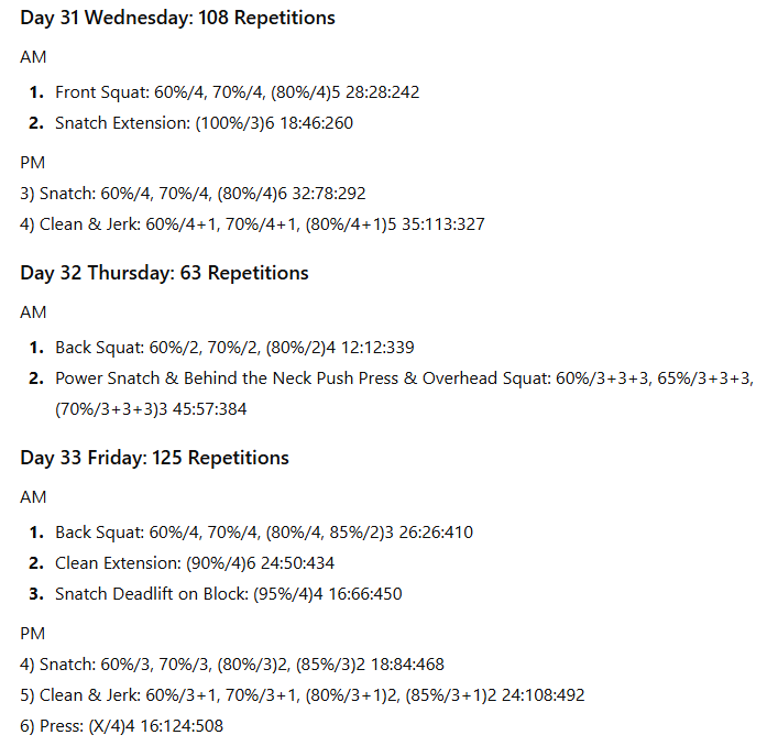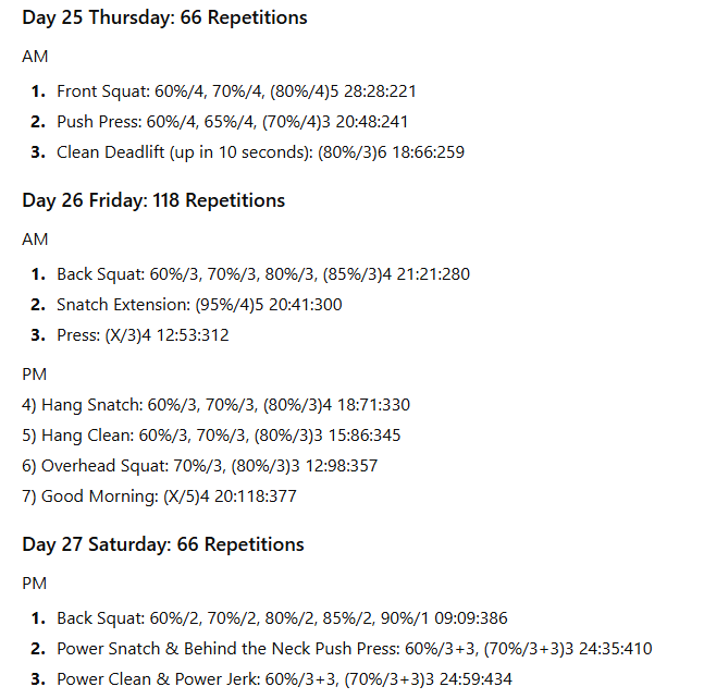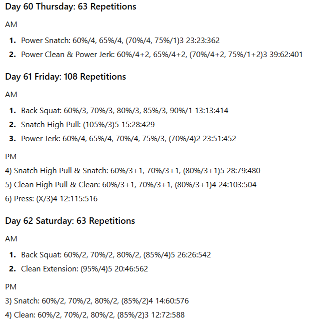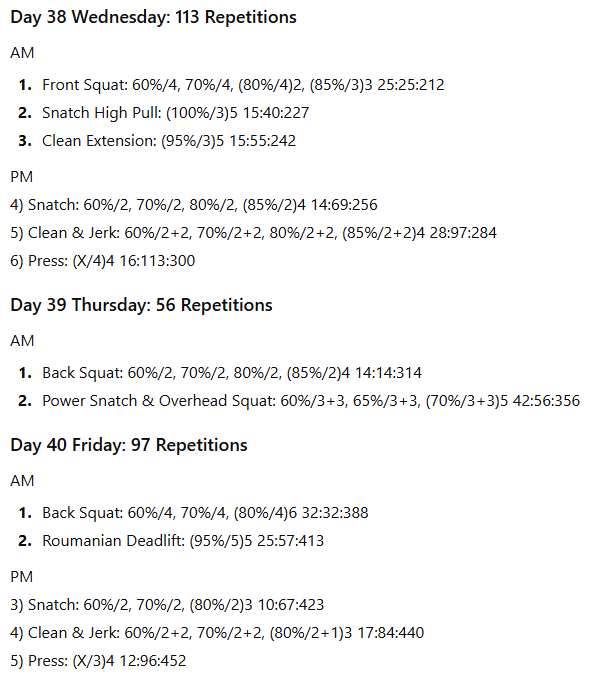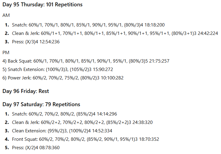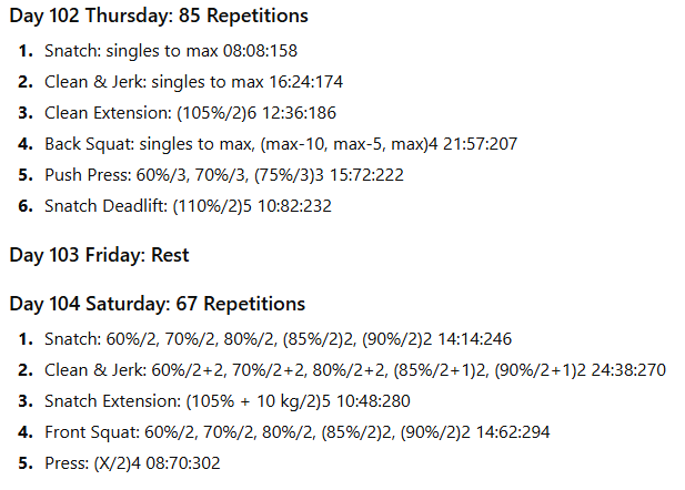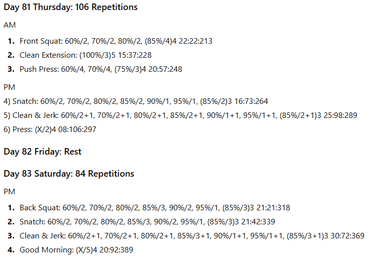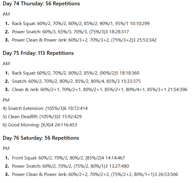 The numbers to the right represent the exercise volume, the daily volume, and the running weekly volume, respectively. On days when the daily volume exceeds 100 repetitions, the training has been divided into two sessions to allow better performance of the lifts in the second session.