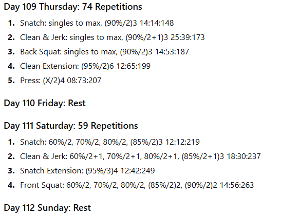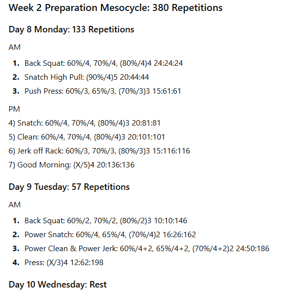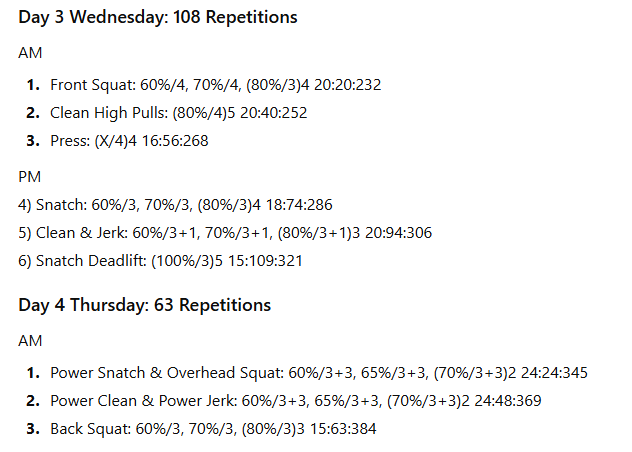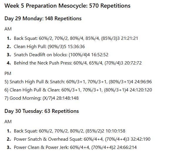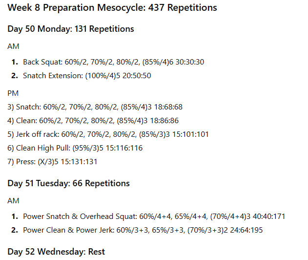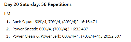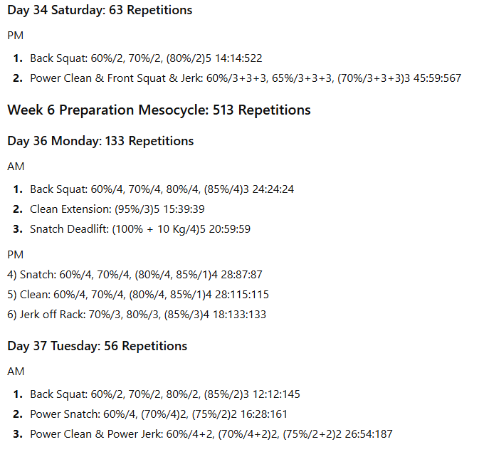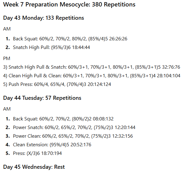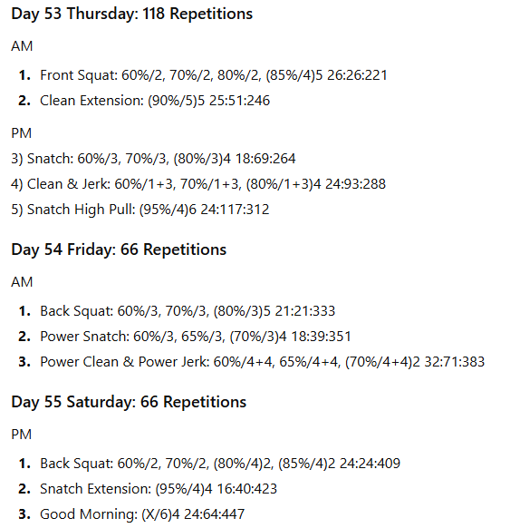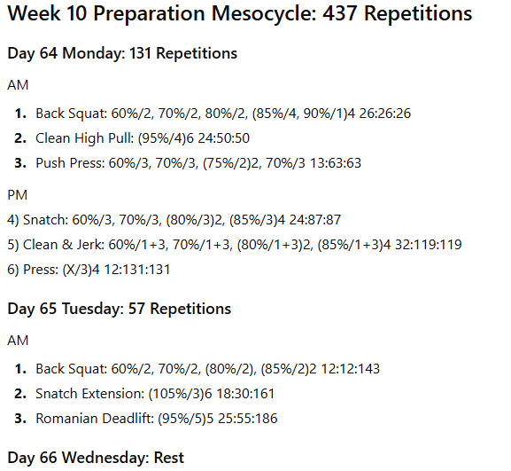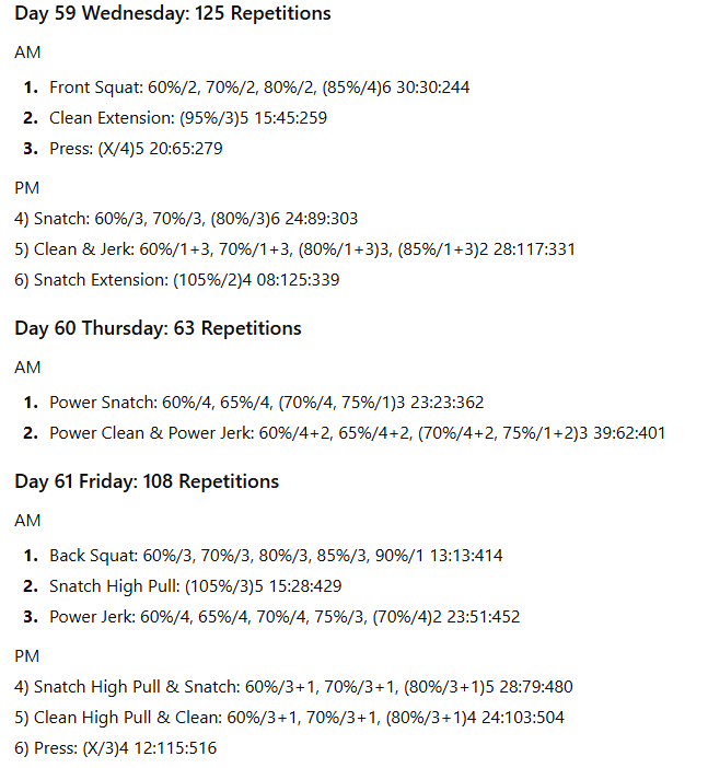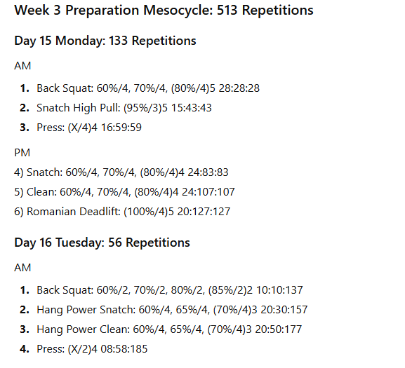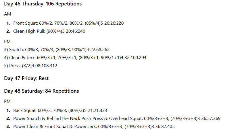 The numbers to the right represent the exercise volume, the daily volume, and the running weekly volume, respectively. On days when the daily volume exceeds 100 repetitions, the training has been divided into two sessions to allow better performance of the lifts in the second session.