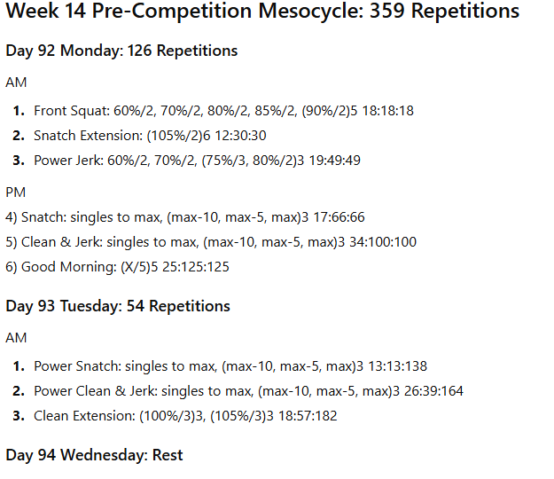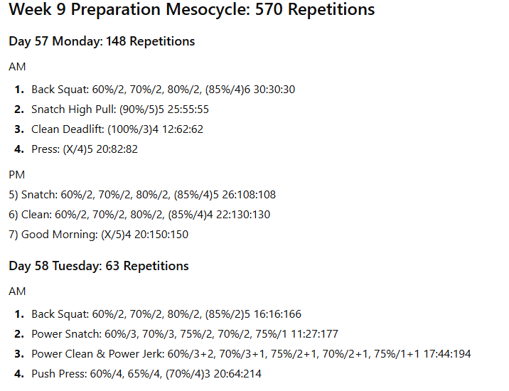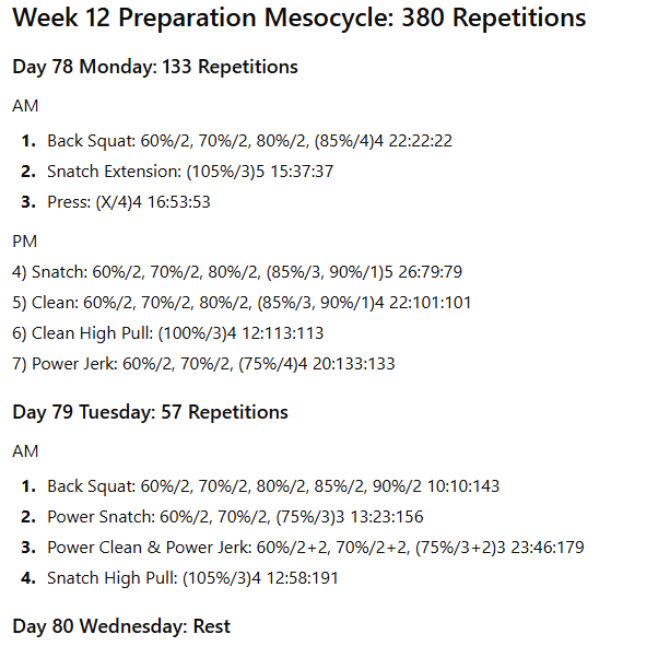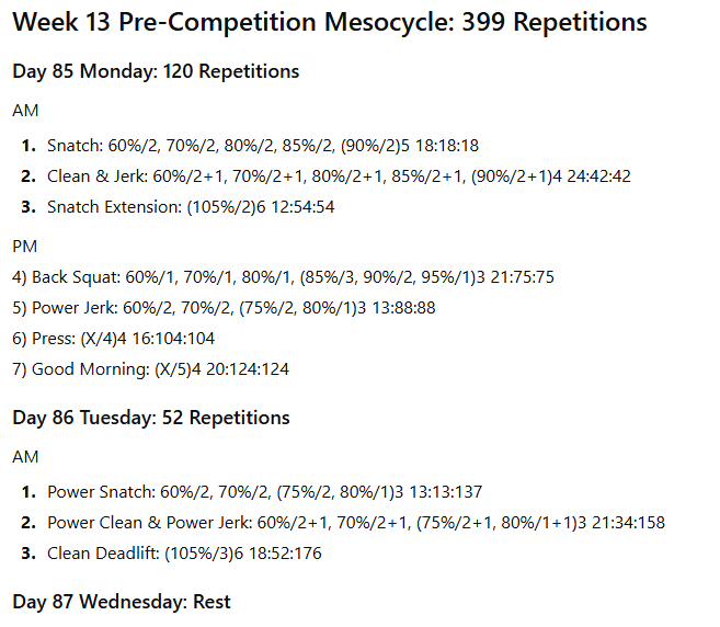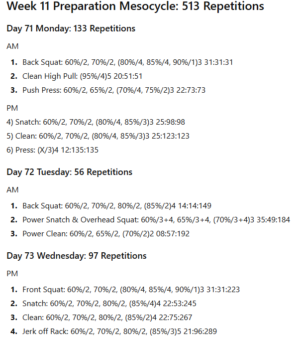 There will be fewer pulling movements performed from the various hang heights and from blocks. There will be very few partial movements unless the athlete is recovering from an injury. The proportion of classical lifts and their derivatives to strength-building exercises will vary considerably between the preparation mesocycles and the pre-competition mesocycles.