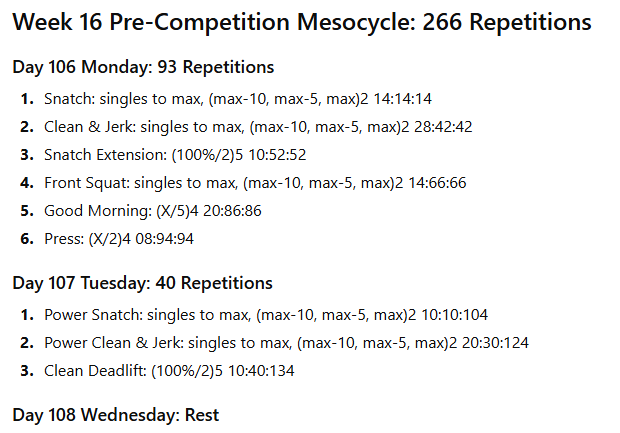 A 17th tapering week should precede the competition. The volume should be approximately 150 repetitions. This creates a 17-week macrocycle.