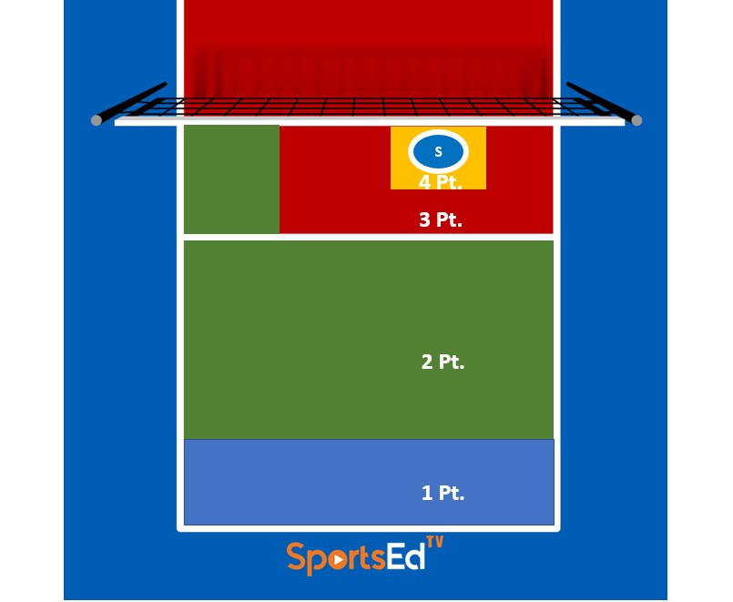 The question is, why are all the receptions in the 3-point area graded equally when the likelihood of scoring is higher from a perfect pass? A perfect pass, which has a higher scoring rate, should be positively weighted. With this in mind, I recommend we put in a 4-point target area reflective of the increased possibility of scoring. Using the same logic, I would make the 2-point passing zone smaller. Most high school-level players will have trouble scoring when the pass is at the edges of the 2-point area. I would reconfigure the Coleman chart in this manner.