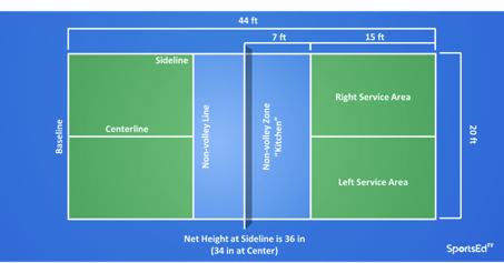At the start of each point, a serve is made from the right-hand court and the serve must clear the non-volley zone. Once the serve is made, the opposing team must hit the ball back over the net and into the court. The ball must bounce once on each side of the court before players can hit it in the air. Players continue hitting the ball back and forth until a fault is made, which results in the loss of the point. Common faults include hitting the ball out of bounds, hitting the ball into the net, or stepping into the non-volley zone and hitting the ball before it bounces. If the serving team wins the point, the same player serves again from the opposite side of the court. If the receiving team wins the point, they become the serving team and alternate serving for the remainder of the game.
