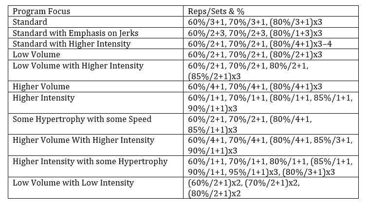 Coaches should not be hesitant about tailoring their rep/set schemes to suit the needs of the athlete and the conditions of training for competition. As long as the appropriate parameters are observed, variants can be programmed. Average relative intensity, macrocycle volume, and mesocycle volume should provide appropriate guidance, as well as reps per set.
