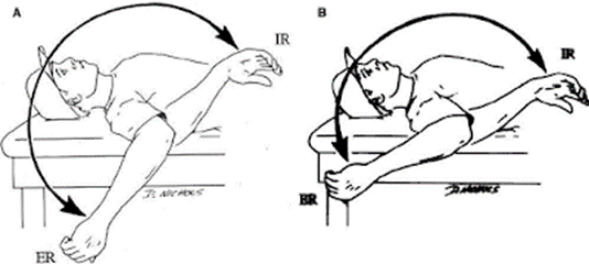 Total shoulder range of motion is a concept that has been described in the orthopedic literature for some time and is a common measurement taken in collegiate and professional athletes (baseball pitchers as an example) during pre-participation physicals. Total shoulder range of motion (TSM) is the range of motion in external rotation (ER – rotating out) and internal rotation (IR – rotating in) when arm is at 90 degrees of abduction (as pictured below). In other words, TSM = ER at 90 degrees abduction + IR at 90 degrees abduction. It is not uncommon for the right and left to have a variance in IR or ER side to side but the total shoulder range of motion (IR + ER) should be close to equal.