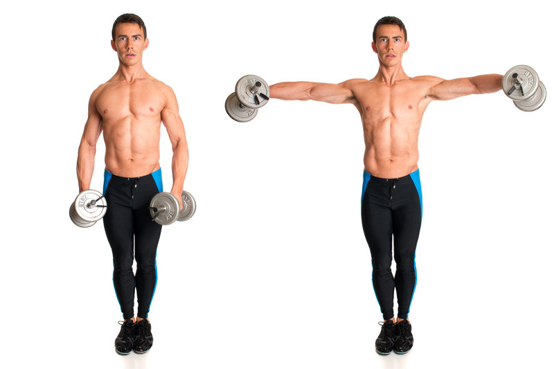 - With a slight bend in the elbows, raise the dumbbells out to the sides.