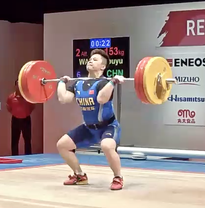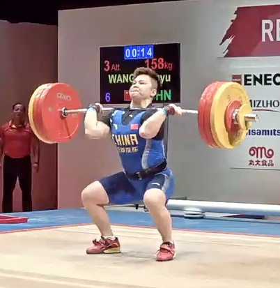 On her final attempt, Wang took 158kg (348lb), again racking the barbell above parallel. She settled into a squat clean, from which she had a very difficult recovery. The jerk was missed.