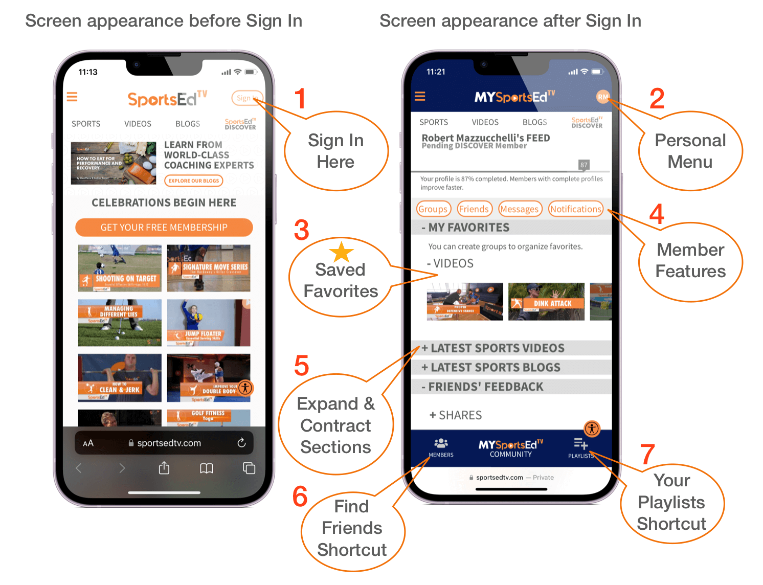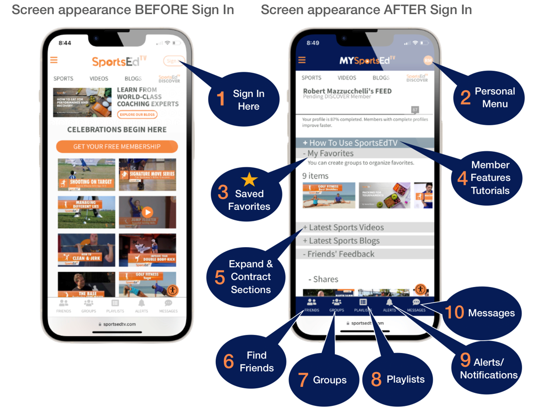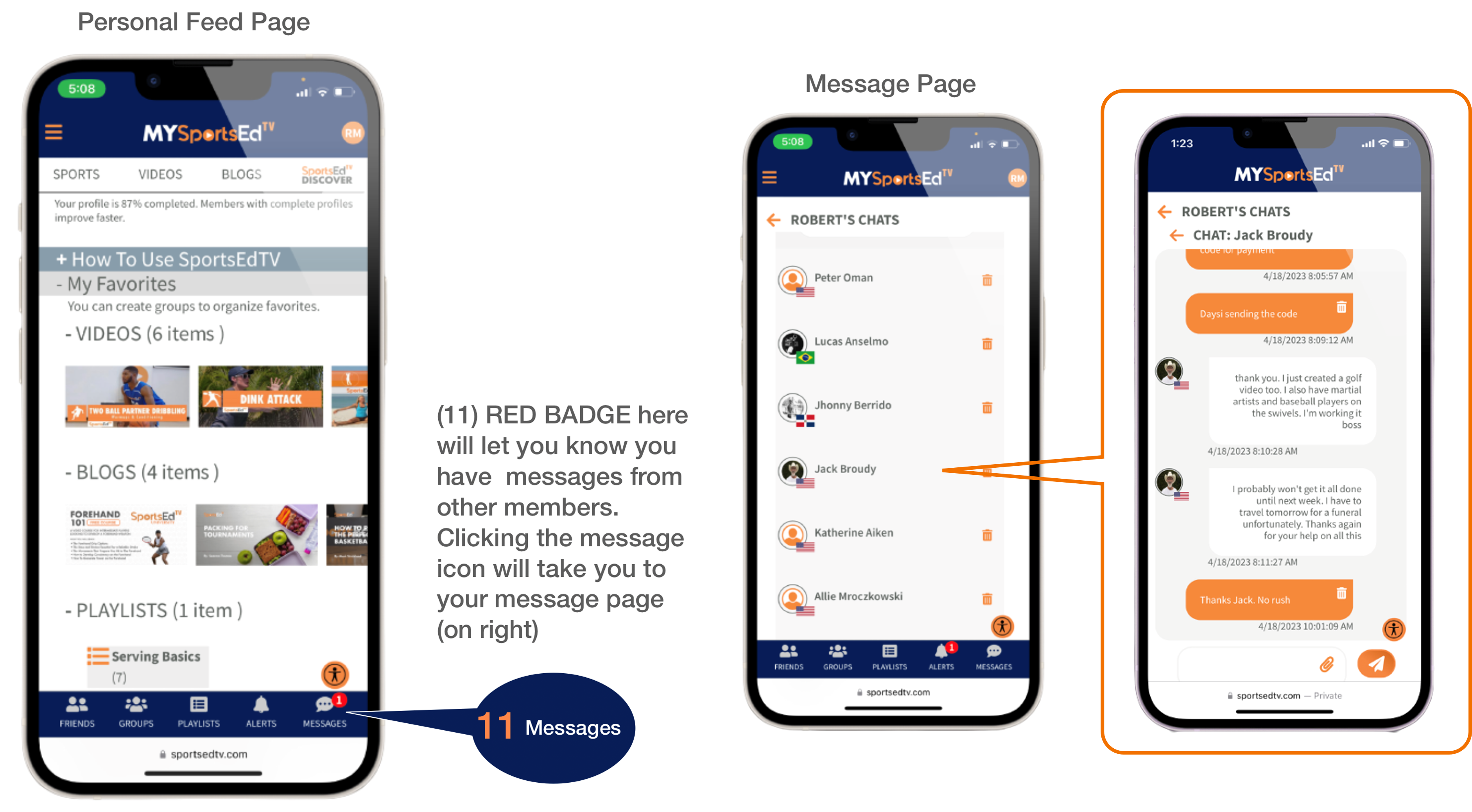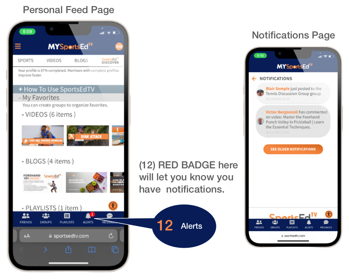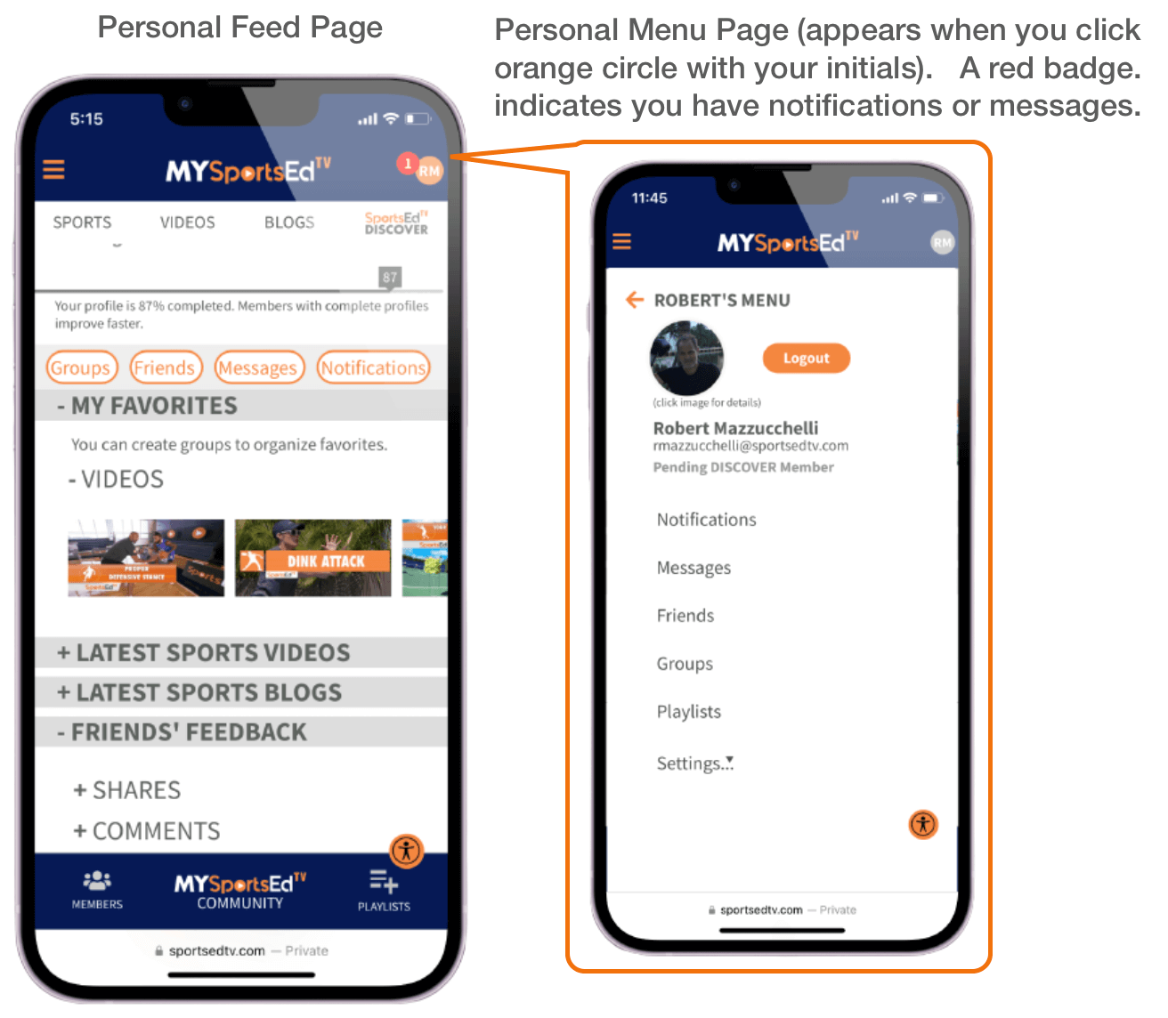 Once you log into SportsEdTV, the system will remember you for six weeks, so no need to log in again. Your homepage when logged in is now your Personal Feed page. Most of the buttons you will need to find content and communicate with friends and groups are located at the bottom of the page. RED BADGES will let you know when someone is sending a message or there is a notification for you.