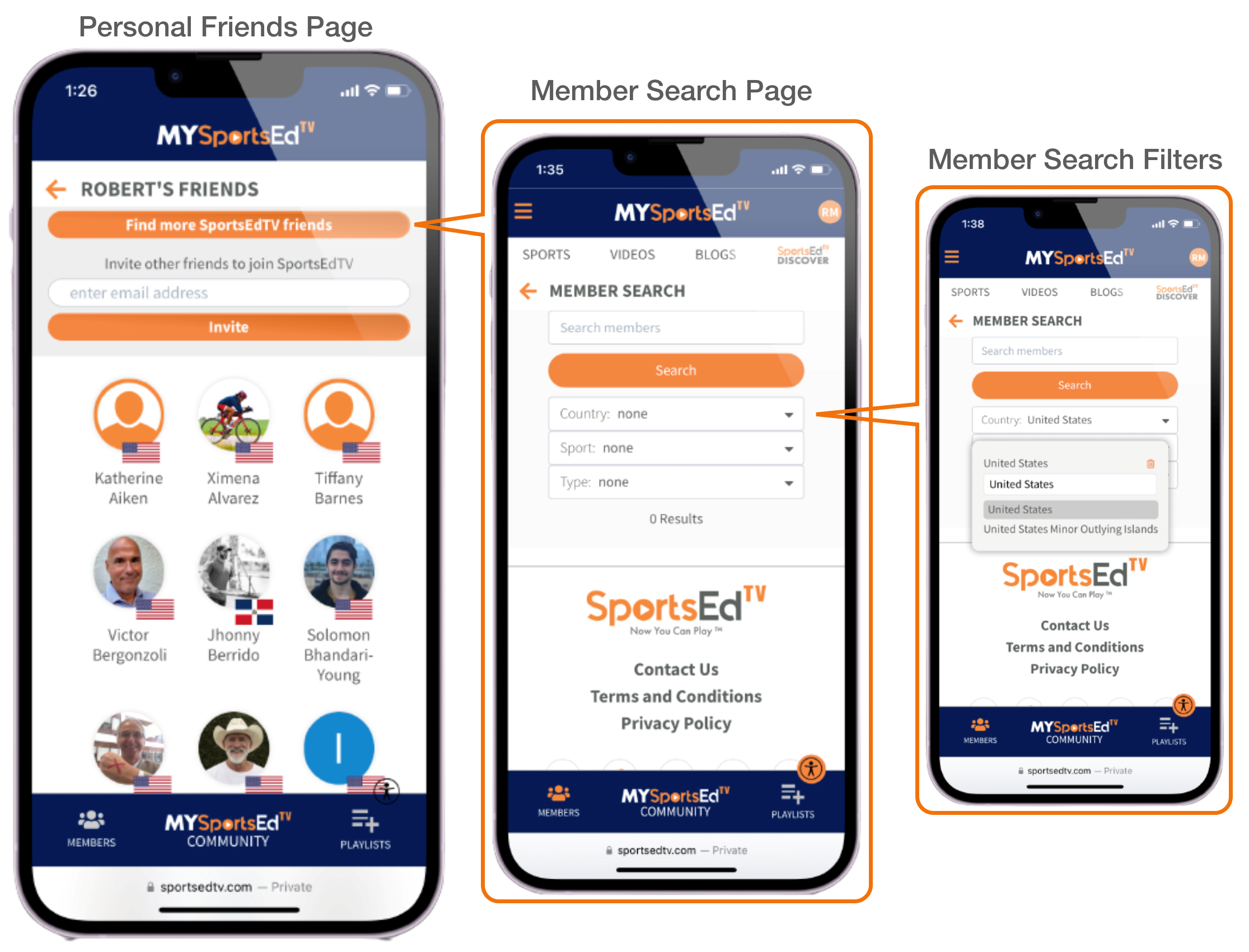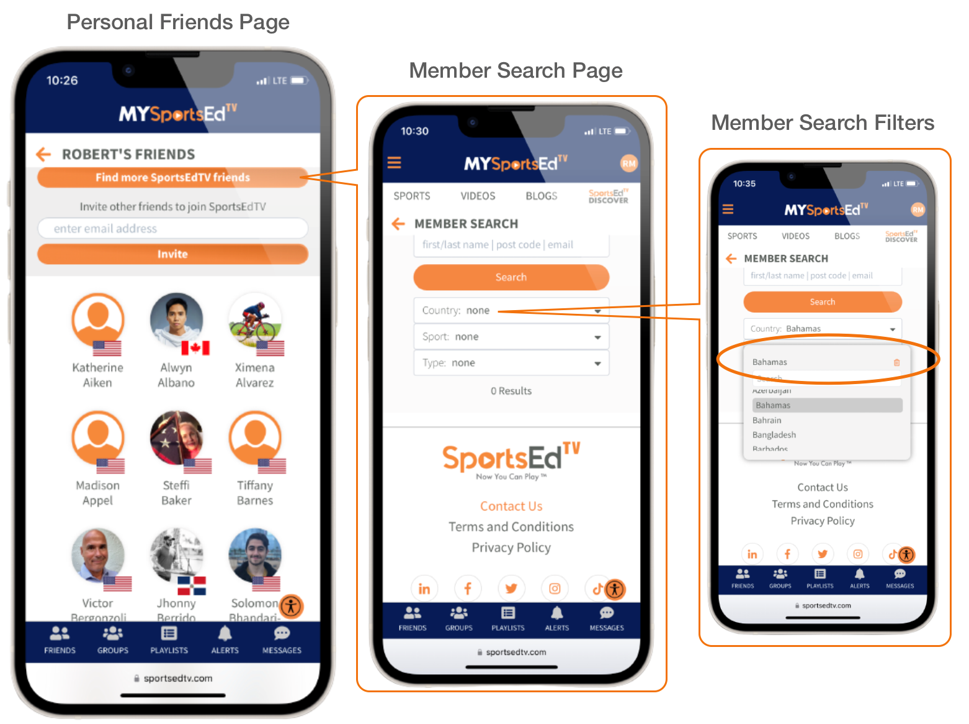 SportsEdTV allows you to browse member profiles and find new friends around the world. Make sure you upload a picture of yourself in your profile so people know who they are connecting with - it's always good to put a face with a name. When searching, you can sort by country, sport, or type of member (athlete, coach, or parent), and you can search by name, email or postal code.