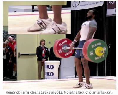 In the clean, three-time USA Olympian Kendrick Farris often does not plantarflex at the top of the second pull. This was very noticeable at the 2011 and 2012 USAW National Championships. When asked about this apparent lack of ankle plantar flexion Kendrick replied simply that his clean weights were relatively light, the power produced adequate, so instead of attempting to further elevate himself and the weights, he chose to pull under. Keep in mind, at the time Kendrick had reportedly cleaned 218kg in training. His first attempts were about 91% effort, a load hardly requiring maximum pulling force.