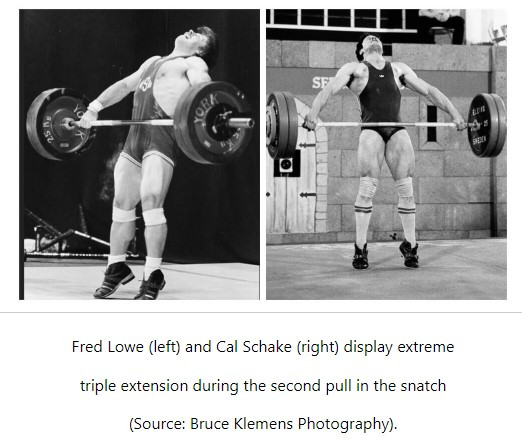 It is an established fact that the greatest power production in elite lifters occurs at the end of the second pull. Performed properly, the second pull creates a maximum force against the barbell. At the top of the second pull, most lifters appear to be triple-extended. Similar to a vertical jump, triple-extension is a natural movement related to elevating the barbell and repositioning the feet to receive the bar either overhead (snatch) or on the shoulders (clean). But the triple extension posture is not critical to lifting success.