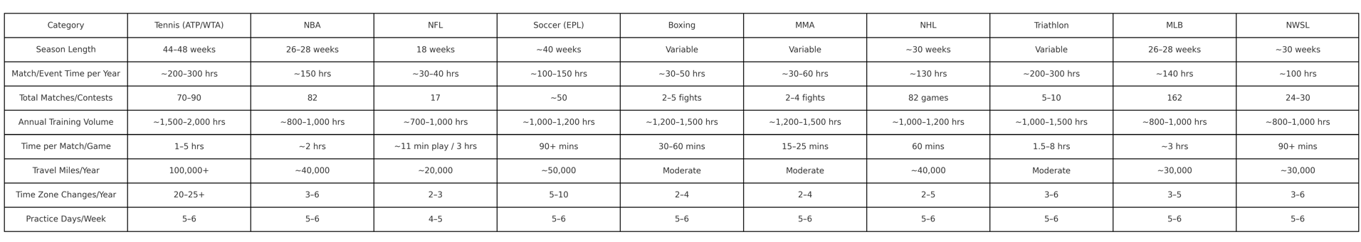 The ATP and WTA Tours span virtually the entire calendar—11 months—leaving only a sliver of December for rest (and even then, many are rehabbing or prepping for Australia). The NFL season lasts about 5 months. NBA and MLB stretch to 7–8 months. Tennis keeps going.